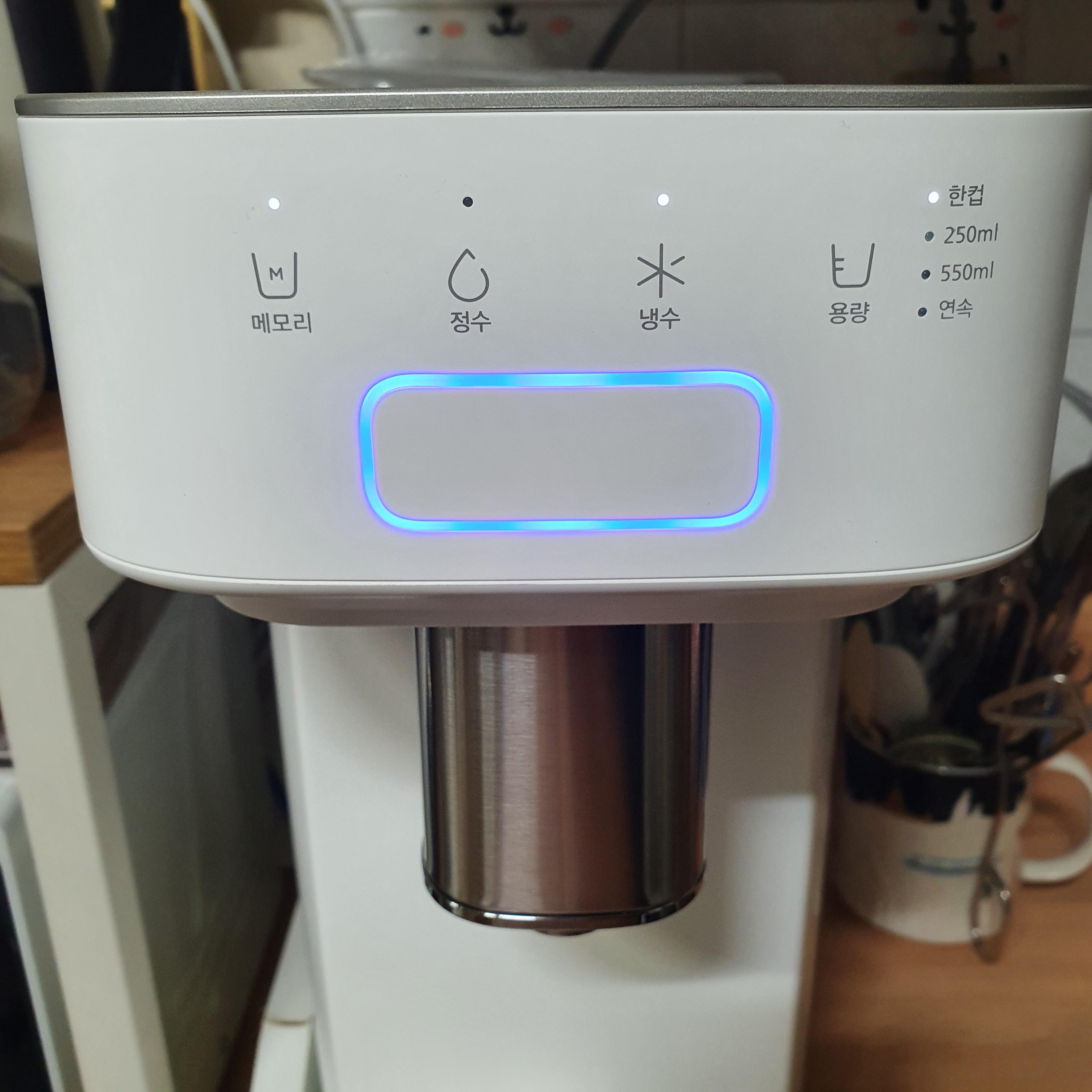 전면부에는 정수, 냉수 선택과 용량 선택, 메모리 선택 버튼이 있어요.